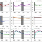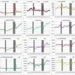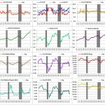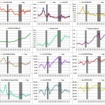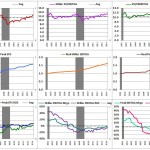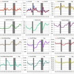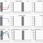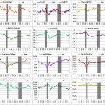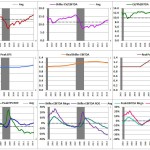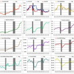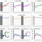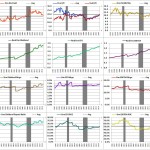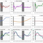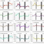 (Legend: The squares show the following metrics (1 to 15, left to right, top to bottom): (1) shiller P/E ratio (real price divided by the of average real ttm EPS seen over the prior 6 years (10 leads to too much information loss), (2) price to peak earnings (P/PkEPS) ratio (real price divided by the highest ttm real EPS earnings reading seen over the prior 6 years), (3) Shiller EV/EBITDA (using 6 years), (4) enterprise value to peak EBITDA (EV/PkEBITDA) ratio (using 6 years), (5) Shiller price to EBITDA ratio (using 6 years), (6) real shiller EPS (average of real ttm EPS over the prior 6 years), real peak EPS (highest ttm EPS seen over the prior 6 years), (7) real Shiller EBITDA (average of real ttm EBITDA over the prior 6 years), (8) real peak EBITDA (highest ttm EBITDA seen over the prior 6 years), (9) real ttm Sales and real ttm Book value, (10) – (14) margins and ROEs for all Shiller and peak metrics (Shiller EPS / sales, Shiller EPS / book value, Peak EPS / sales, Peak EPS/ book value, Shiller EBITDA / sales, Shiller EBITDA / book value, peak EBITDA / sales, peak EBITDA / book value, (15) asset turnover, i.e., sales / book value.)