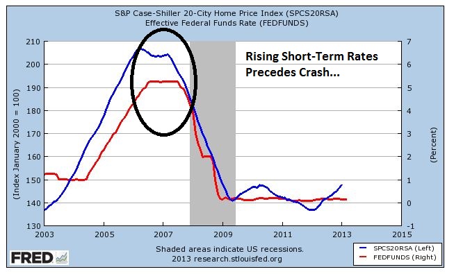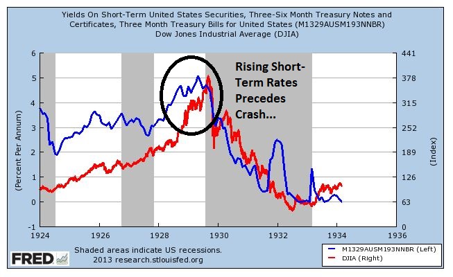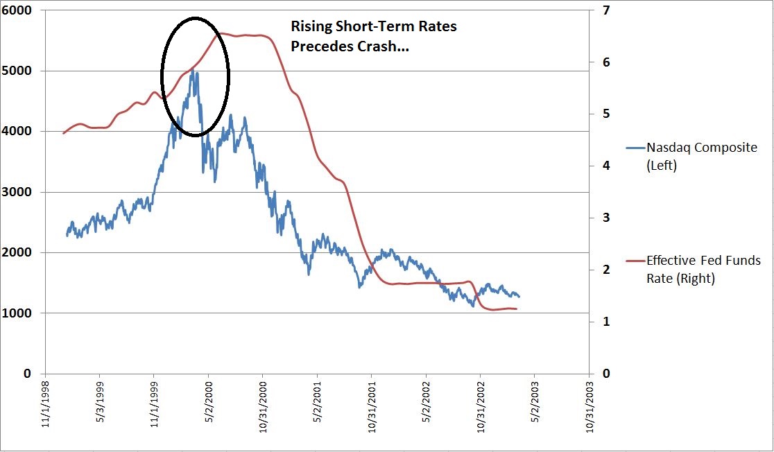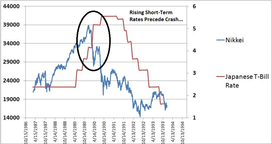 Well done, but I don’t think investors should be anticipating a crash any time soon. Historically, major asset bubble crashes have always been preceded by rising short-term interest rates.