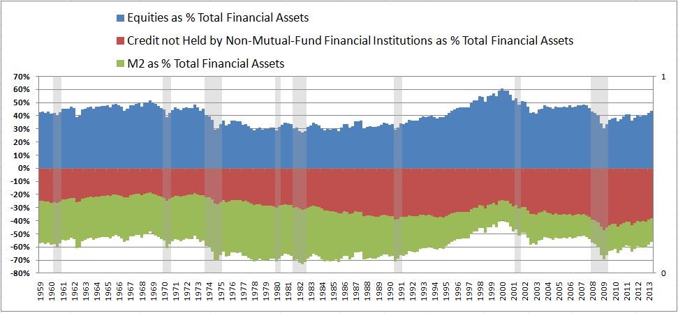 To double check our work, we can calculate the same value differently, by taking the financial universe to be composed of M2 (a valid proxy for total cash in the economy), equities, and credit assets not held by non-mutual-fund financial institutions. The following chart reveals a similar allocation to the one above, but splits money and credit apart: