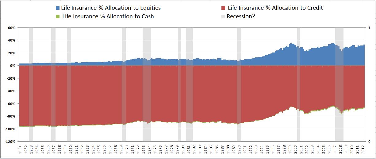 The following chart shows the composition of total financial assets of Life Insurers (~$5T). Life Insurers have historically been trending towards a higher equity allocation, which is near record highs: