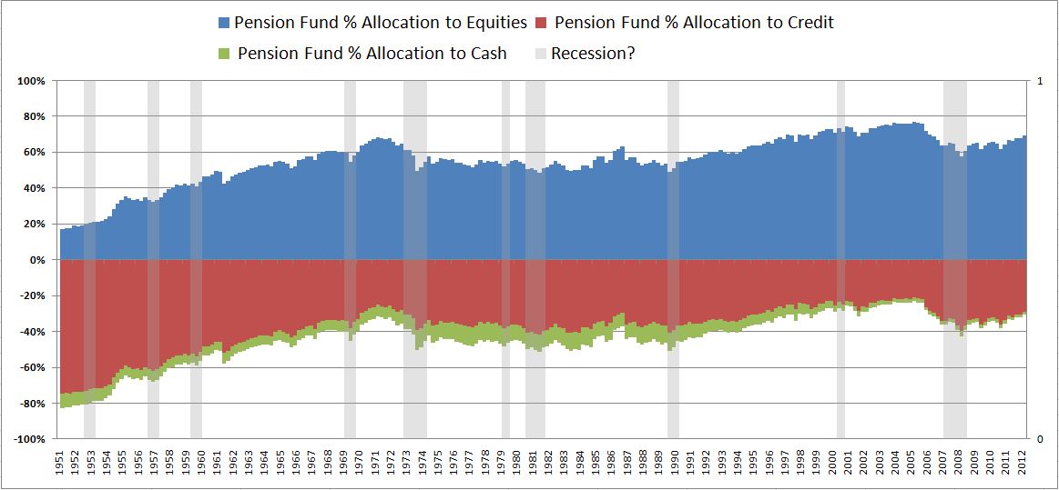 The following chart shows the composition of Total Pension Fund Financial Assets (~$6T in total). Pension Funds are clearly overallocated to equities, and have been trending towards a higher allocation since the 1950s.