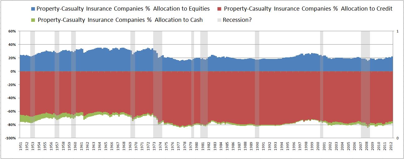 The following chart shows the composition of total financial assets of Property-Casualty Insurers (~$1.2T). Property-Casualty Insurers are underallocated to equities relative to the past: