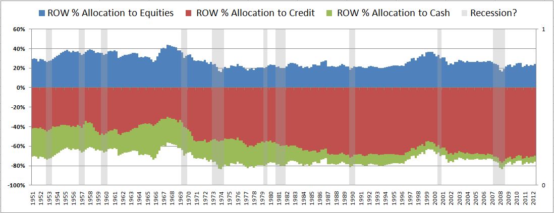 - The relevant universe of financial assets is composed of equity (stocks), credit (bonds), and money (cash). The extent to which individual sectors of the economy (Households, Pension Funds, Life Insurers, etc.) and the economy in aggregate have allocated wealth to these categories can be determined from the Flow of Funds report.