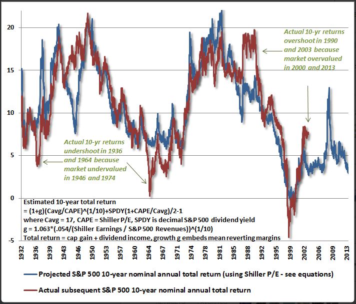 Notably, the fit doesn’t appear to be that strong, particularly in comparison to the metric we proposed (shown below).  There appear to be a number deviating periods, some unrelated to the alleged valuation excesses.  The metric is estimating between 2% to 3% returns over the next 10 years.  But, let’s be realistic, it can’t assert those numbers with any more confidence than it might assert 5% or 6%–a few ticks higher on the chart. The difference makes a big difference: in this case, the difference between stocks being fairly valued (relative to the likely long-term returns of cash and bonds) and overvalued.