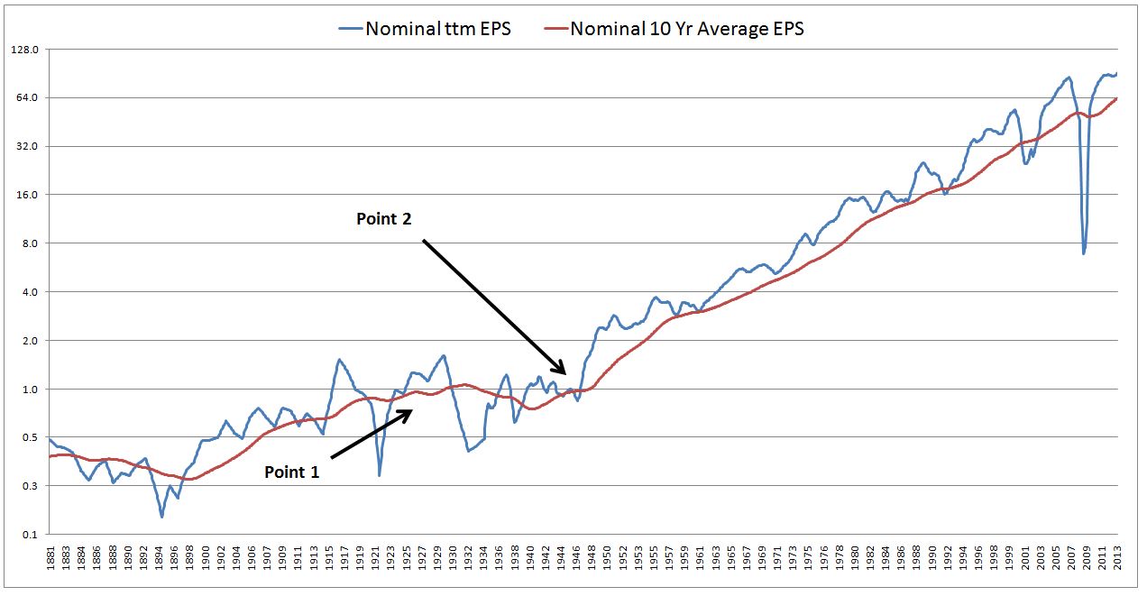 The following chart shows nominal ttm EPS (GAAP) alongside nominal 10 year average ttm EPS (GAAP) from 1881 to 2013: