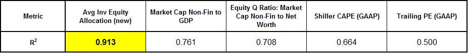 The original chart of equity allocation is operational proof of this point.  A variable that seemingly has nothing to do with valuation predicts returns substantially better over the data set than all of the profit-margin-mean-reversion valuation metrics, and also the Shiller CAPE metric.  It turns out that there are interesting reasons, unrelated to valuation, why that might be the case–but those points are secondary here.
