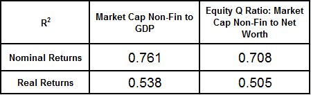 Notably, if you attempt to correlate the metrics to real returns, the performance gets worse.  So what you have is a valuation metric that cannot predict real returns, but only nominal returns–even though it knows absolutely nothing about inflation: