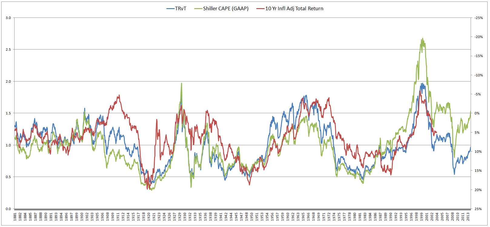 Of  note, TRvT actually has a better correlation with future real returns than Shiller CAPE. From 1881 to 2003, it’s r-squared was 0.52, versus Shiller CAPE’s abysmal 0.32.  The following chart shows 10 year inflation adjusted total returns (inverted) alongside TRvT and Shiller CAPE (both normalized to their historical averages):