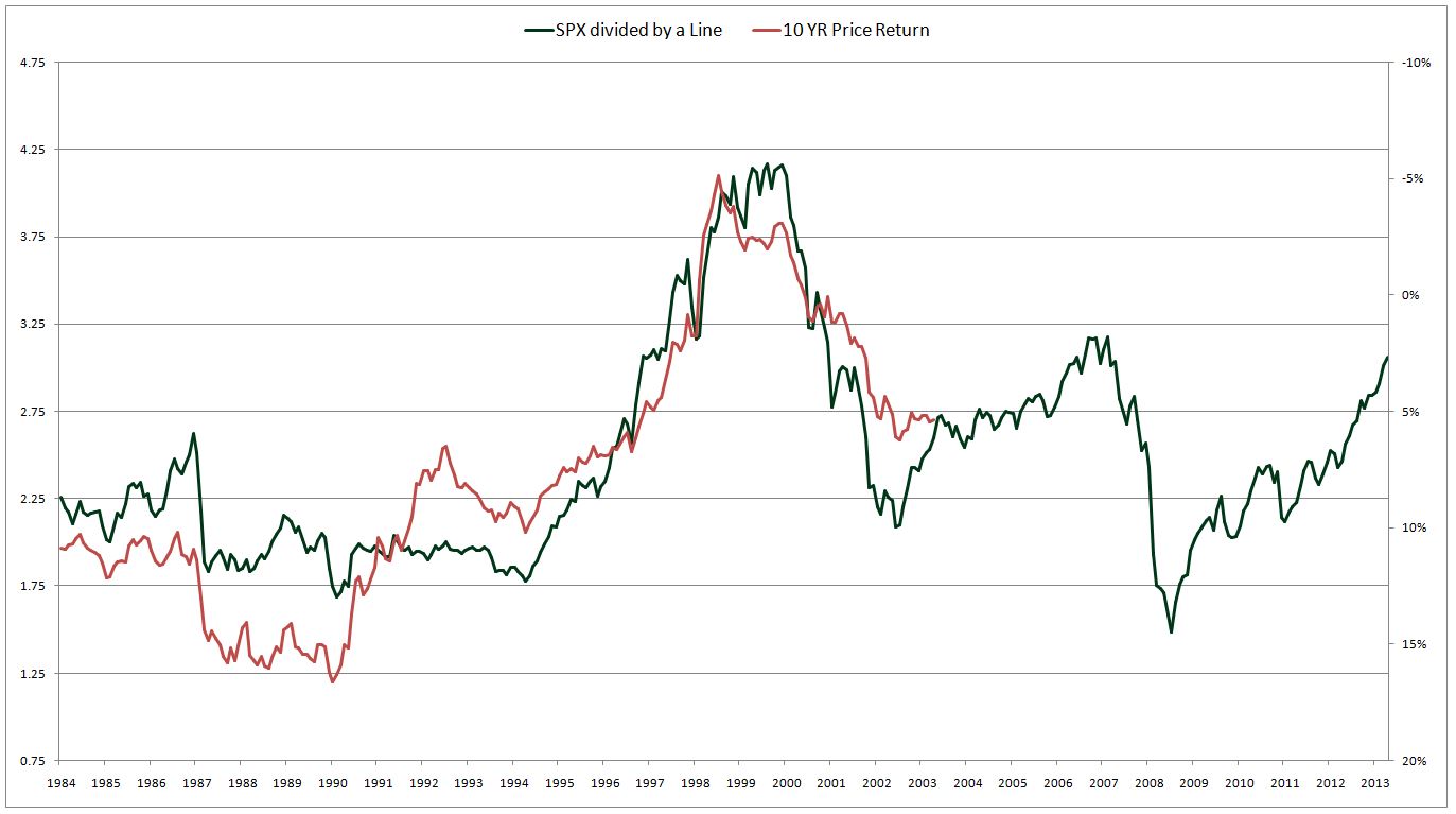 The line that I chose for the denominator of the metric goes from roughly 1/3 the S&P 500 level in 1982 to roughly 1/3 the S&P 500 level in 2013.  The line rises gradually and is noise-free, therefore any change in price shows up as a deviation in the metric’s value, just as it shows up as an inverse change in the future return.  The line roughly keeps up with the S&P 500 over the long-term, which is why it stays in a range on the chart.
