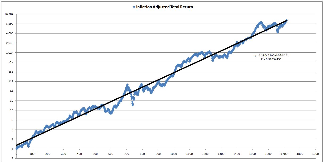 Let me illustrate the importance of out-of-sample testing with another example, potentially more relevant and useful.  The following chart shows the inflation-adjusted total return of the S&P 500 from 1871 to 2013 (x-axis is the number of months since January 1871):