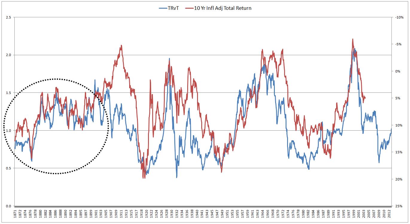Let’s define a new valuation metric, we’ll call it TRvT (Total Return vs Trend).  TRvT is calculated by taking the actual real total return of the S&P 500 (measured from 1871 forward) and dividing it by the real total return that would have been realized if the S&P had been on its exponential trendline from 1871 to 2013.  The conceptual assumption behind the metric is that real total returns naturally follow a long-term trendline, which we approximate exponentially.  In periods where total returns rise above that trendline, subsequent total returns end up being lower than normal, so as to bring the overall total return back to trend.  And vice-versa.
