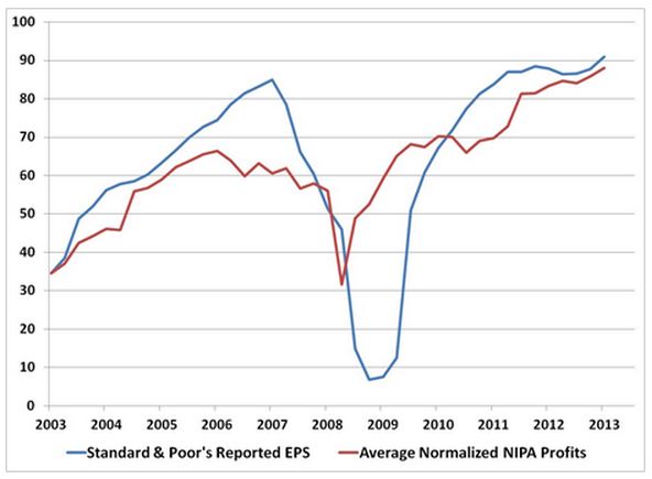 Notice that the blue line (reported earnings) rises well above the red line (NIPA profits normalized to reported earnings) during the 2003-2007 expansion, but then falls well below it during the 2007-2009 recession. The implication is that in the “good” times, reported earnings grow more than they should (based on a comparison with NIPA profits), suggesting an exaggeration, and that in the bad times, the exaggeration is given back (via “justified” writedowns). The giveback appears to bring reported earnings and NIPA profits into uniformity across the entire cycle.