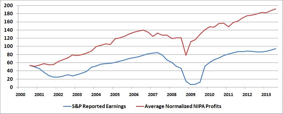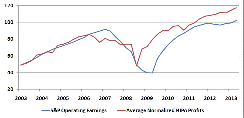 Consider what the graph looks like when we normalize NIPA profits to S&P operating earnings instead of reported earnings:
