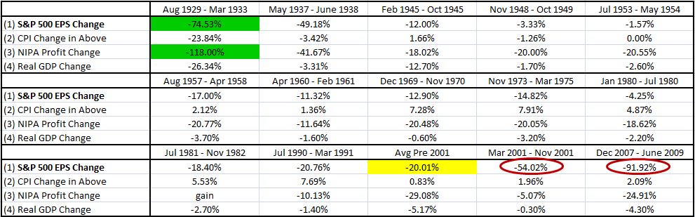 The following table shows the changes in earnings and other economic variables that occurred in each of the fourteen recessions from 1929 to 2013. We take a period starting six months before the beginning of the recession, and ending six months after its termination. For each period, we calculate (1) the change in S&P reported earnings from peak to trough, (2) the change in CPI that occurred alongside the reported earnings change, (3) the change in NIPA profits from peak to trough, and (4) the change in real GDP from peak to trough.