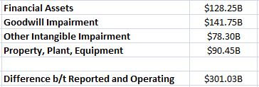 The difference between reported and operating earnings for calendar year 2008 was around $300B. Of that amount, we know that $220B, or 70%, came from impairment losses on goodwill and other intangible assets. The other 30% would then have to be divided between writedowns to financial assets, property, plant, and equipment (PPE), and any other excluded charges that explain the difference.