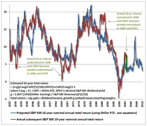 Bill concludes his defense by presenting a chart from John Hussman that correlates the Shiller CAPE to future 10 year returns (my emphasis in green):