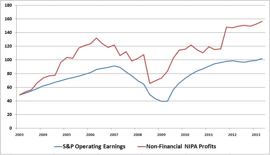 The following chart normalizes non-financial NIPA profits to S&P operating earnings:
