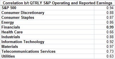 Notably, the correlation between financial sector operating and reported earnings in the S&P series from 1Q 2008 to 3Q 2013 is the highest of any sector: