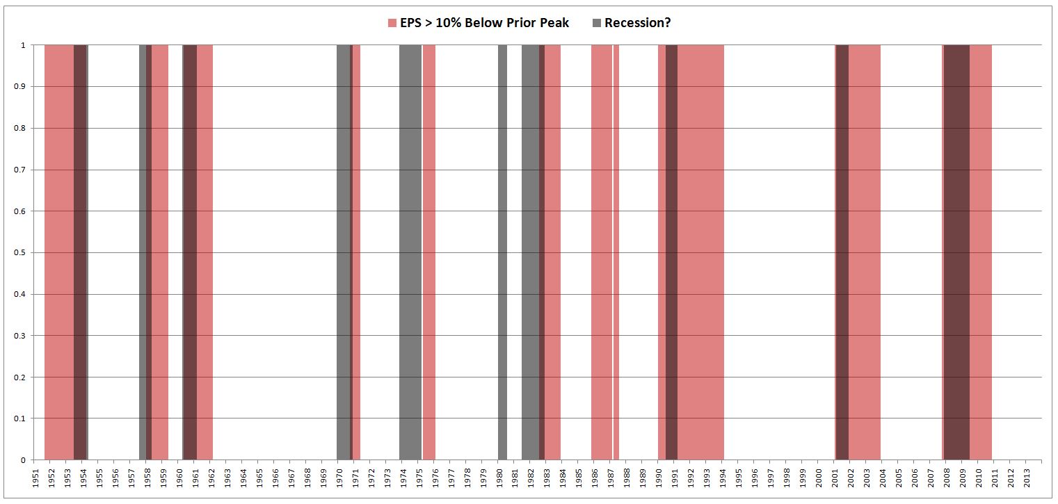 The following chart shows recessions (black columns) and periods where S&P 500 EPS was more than 10% below its prior peak (red columns) from 1951 to 2013.