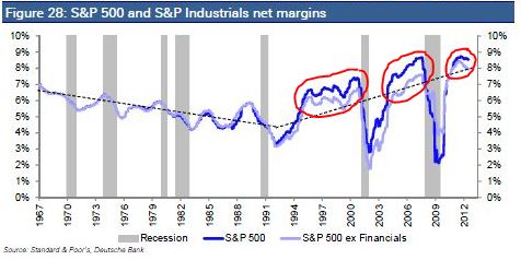 The following chart, borrowed from Deutsche Bank (my red emphasis), shows net profit margins for the S&P 500 back to 1967: