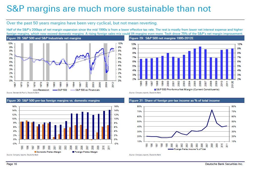 Outside of recessions, the observed elevation in S&P 500 profit margins has been quite persistent. David Bianco of Deutsche Bank has done excellent work work to uncover some of the structural reasons why.