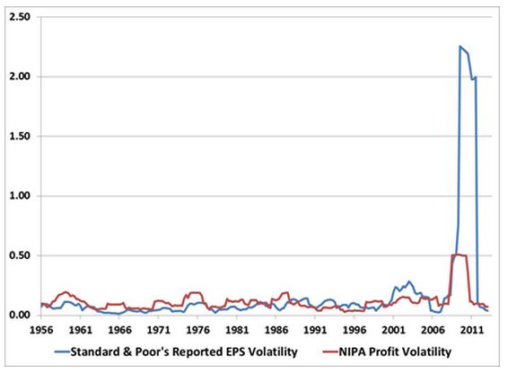 Smithers blames the rise in the blue line (reported EPS volatility) relative to the red line (NIPA profit volatility) on changes in executive compensation practices that have occurred over the last few decades. But there is a far more compelling explanation available, an explanation that Smithers seems to have missed: that changes to accounting regulations pertaining to goodwill and other types of writedowns have fueled a significant increase in reported earnings volatility, particularly around recessions. Those changes were instituted abruptly around the first rise, 2001. Their impact exploded in the financial crisis.