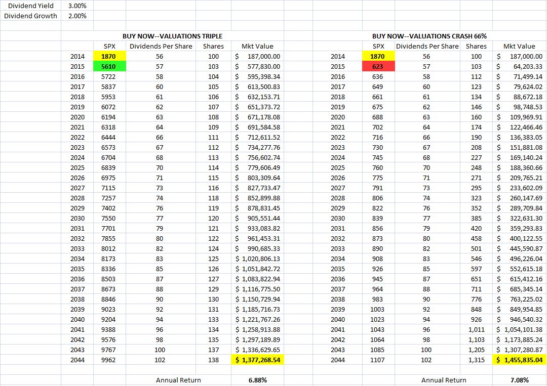 Suppose that you’re a middle-aged professional with a 30 year retirement time horizon. Your portfolio is 100% invested in U.S. equities–it consists of 100 shares of the S&P 500, worth $187K at current market prices. Assuming that the fundamentals remain unchanged, which outcome would leave you wealthier at retirement: (1) for the S&P 500 to soar 200% in a glorious bubble-like melt-up, or (2) for the S&P 500 to plunge 66% in a brutal Depression-like crash?