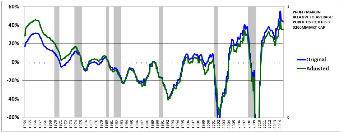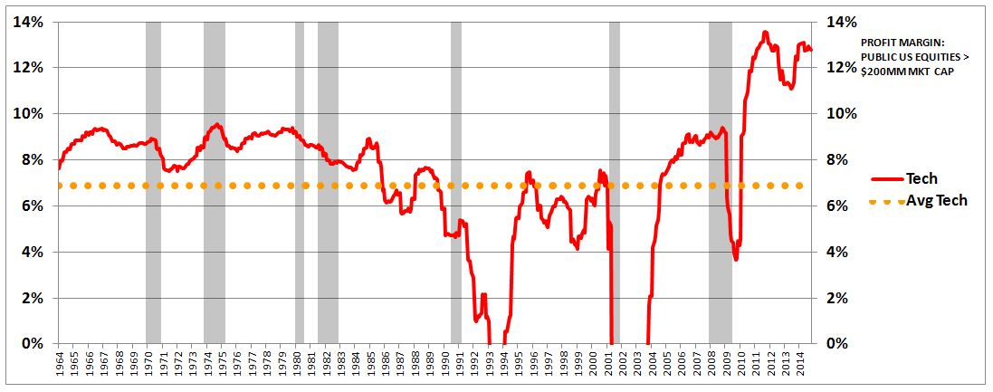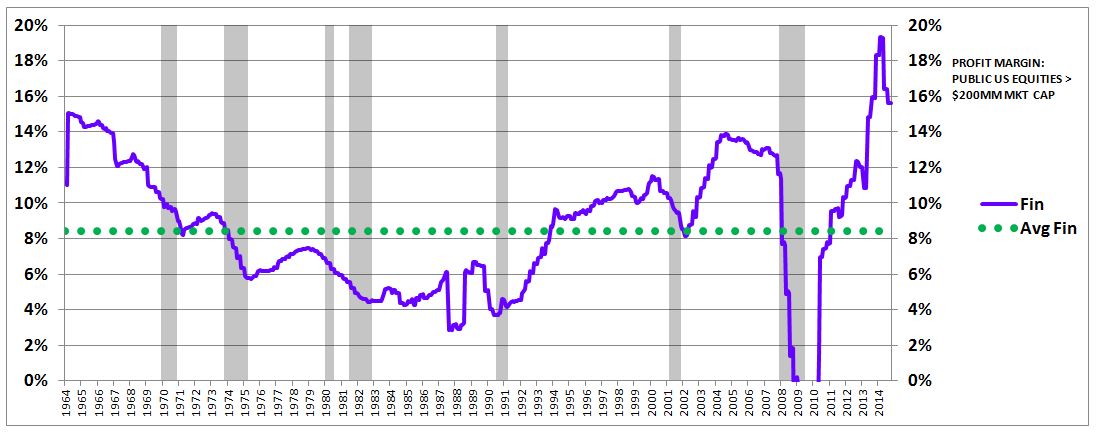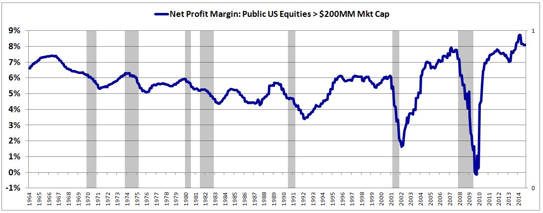 The following chart shows the aggregate net profit margin of publically-traded U.S. equities with market capitalizations greater than $200MM from January 1964 to October 2014. Recessionary periods are shaded in gray.
