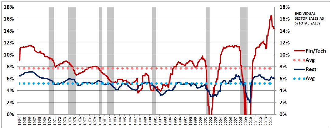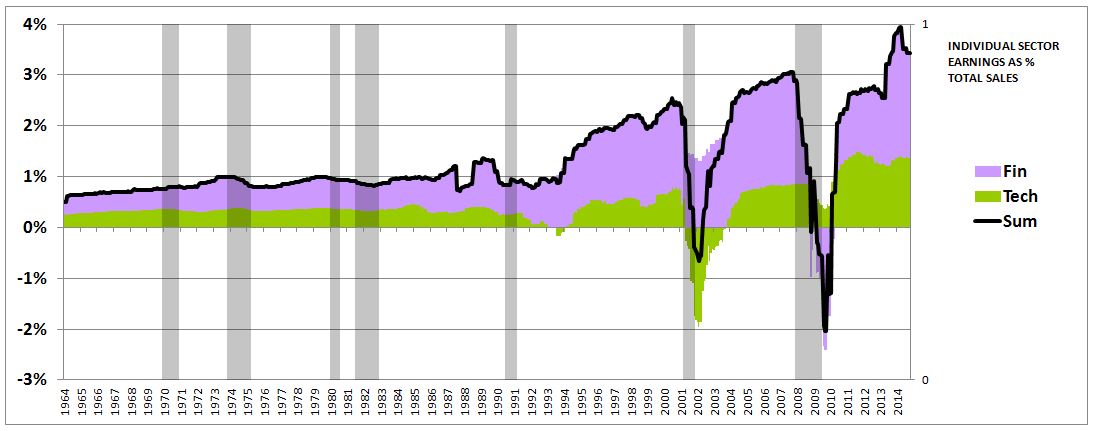 The reason that the adjustment doesn’t make the kind of difference that we might otherwise expect is that the profit margins of the financial and technology sectors have themselves expanded dramatically in recent years. The truth is that profit margin increases within the financial and technology sectors, rather than increases in their contribution to total revenue, have been the primary drivers of the aggregate profit margin increase.