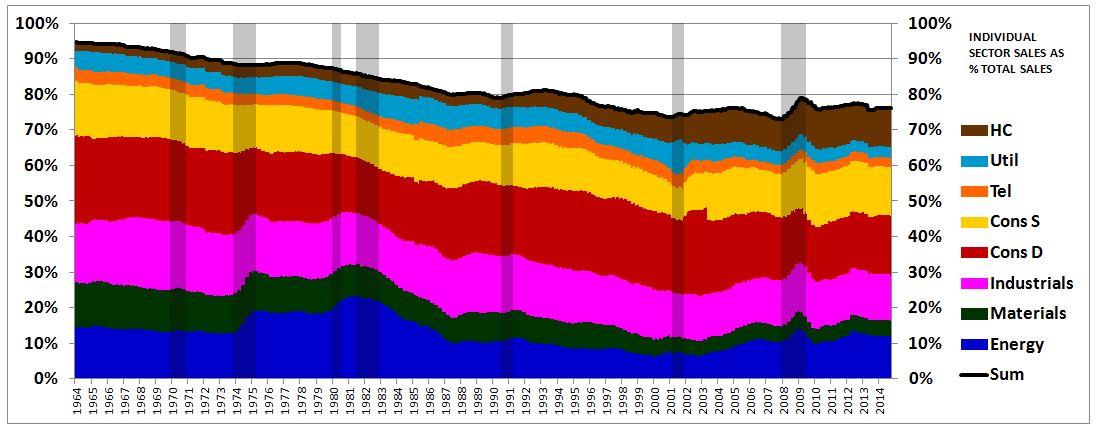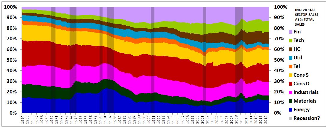 A better way to think about what has happened here is to think in terms of sectoral revenue contributions: revenues of individual sector as a percentage of the total revenue of all sectors. The following chart shows the evolving revenue contributions of each sector, from January of 1964 to October of 2014.