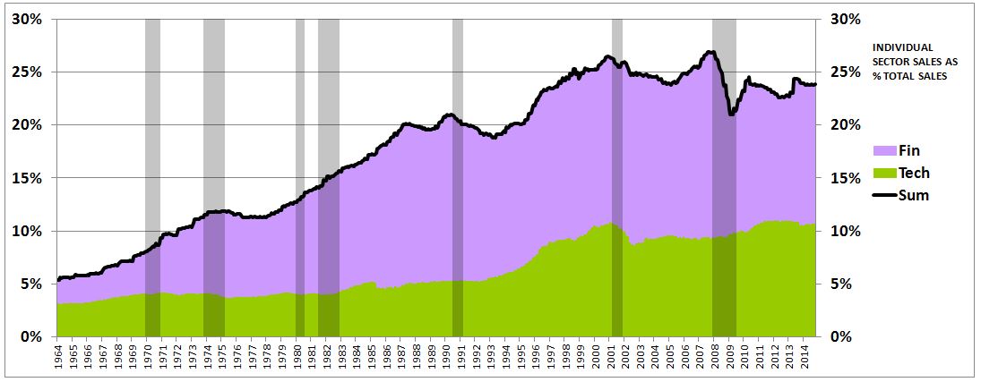 As the chart illustrates, the revenue contribution of the combined financial and technology sectors–the amount of total revenues that are revenues from those sectors–has increased substantially over time. In January of 1964, the revenue contribution was 5.41%. Today, it is 23.83%–almost a quarter of the total.