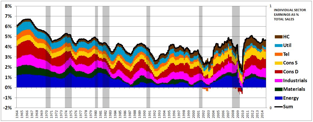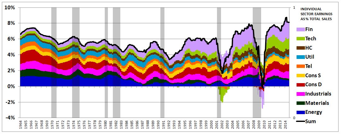 The next chart separates out the contribution to the aggregate profit margin by sector. For each sector, the colored area represents the individual earnings of the sector divided by the total revenues (sales) of all sectors. Note that the sum, the black line, is just the aggregate profit margin shown in the previous chart.