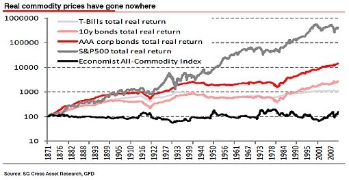There’s a particularly interesting and relevant analogy that bears can raise in this context, one that involves a different sector: commodities. The historical evidence on the real return potential of spot commodities is overwhelming: there is no real return potential, spot commodities do not offer real returns. For proof, consider the following 130 year chart from Dylan Grice. Notice the black line languishing stupidly at the bottom: