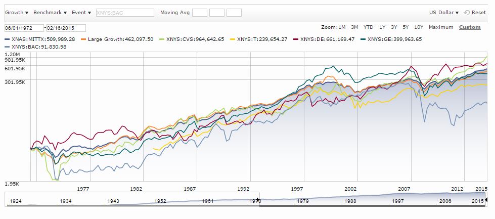Judging from the familiar names that Read is reported to have owned–AT&T, Bank of America, CVS, Deere, GM, GE, and so on–alpha generation doesn’t appear to have been the main driver of his success (though it was probably a contributor). Over the last 40 years, those names have roughly tracked the large cap index, as you can see in the chart below.