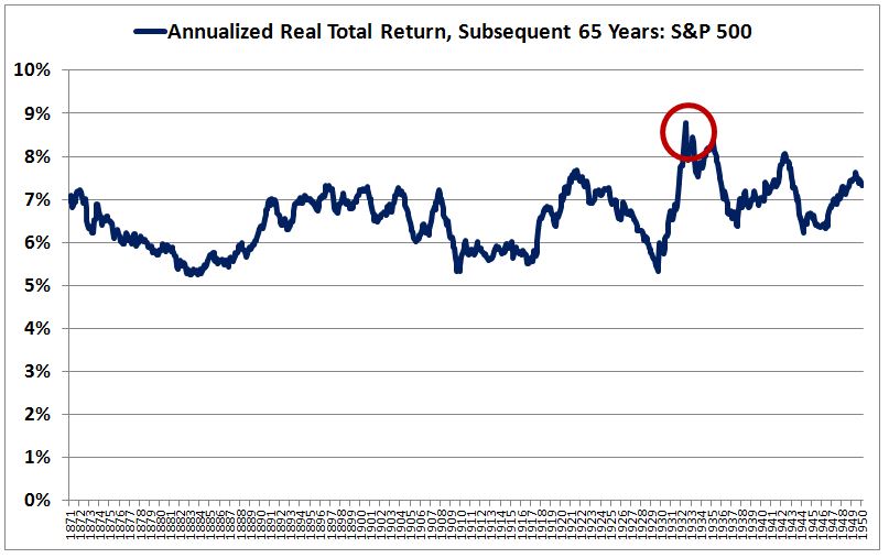 The following chart shows the annualized real total return of the S&P 500 for 65 year periods beginning in 1871 (endpoint 1936) and culminating in 1950 (endpoint today). All dividends are reinvested at market prices. The 1932 bear market low is circled in red for reference.